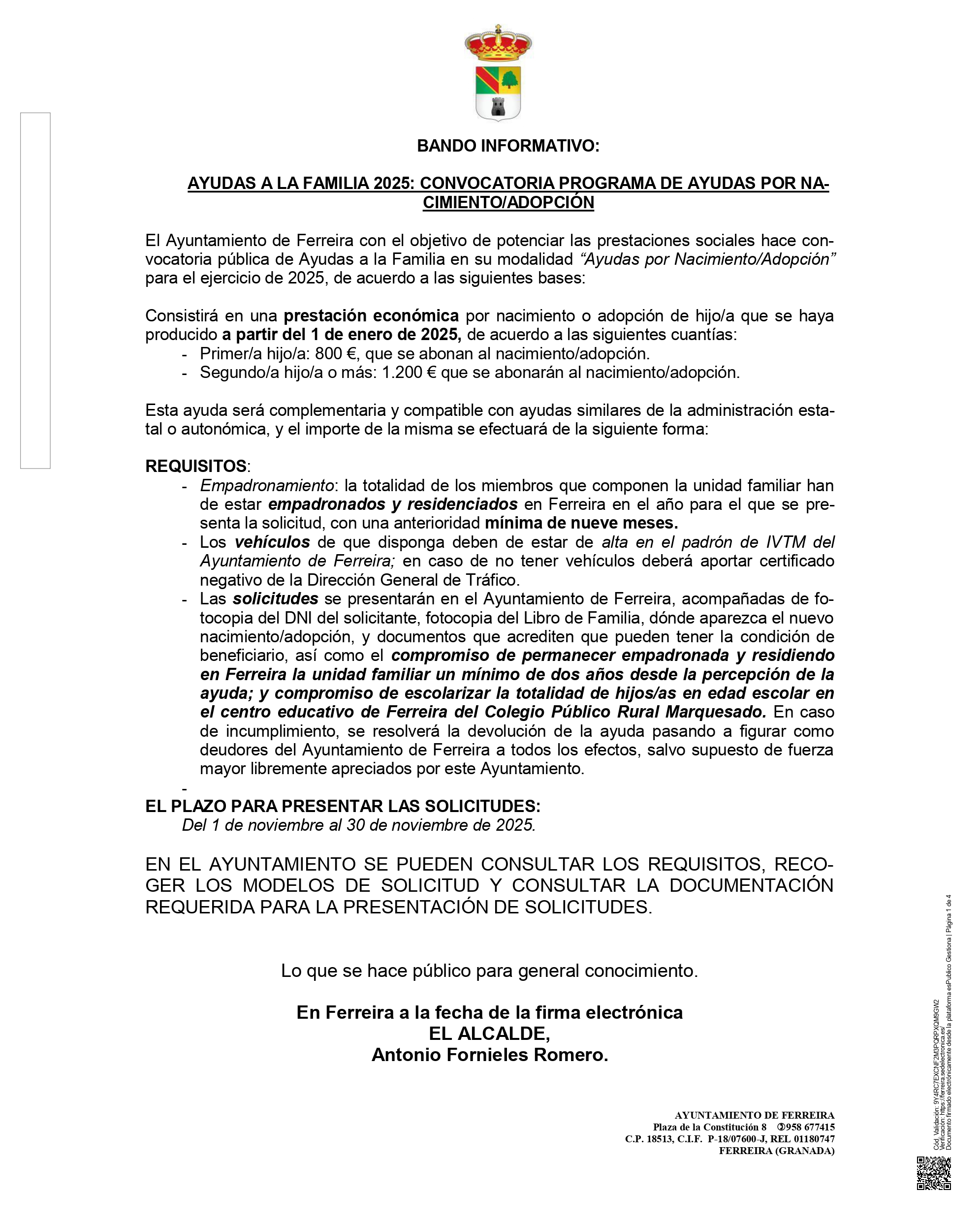 - Las solicitudes se presentarán en el Ayuntamiento de Ferreira, acompañadas de fotocopia del DNI del solicitante, fotocopia del Libro de Familia, dónde aparezca el nuevo nacimiento/adopción, y documentos que acrediten que pueden tener la condición de beneficiario, así como el compromiso de permanecer empadronada y residiendo en Ferreira la unidad familiar un mínimo de dos años desde la percepción de la ayuda; y compromiso de escolarizar la totalidad de hijos/as en edad escolar en el centro educativo de Ferreira del Colegio Público Rural Marquesado. En caso de incumplimiento, se resolverá la devolución de la ayuda pasando a figurar como deudores del Ayuntamiento de Ferreira a todos los efectos, salvo supuesto de fuerza mayor libremente apreciados por este Ayuntamiento.