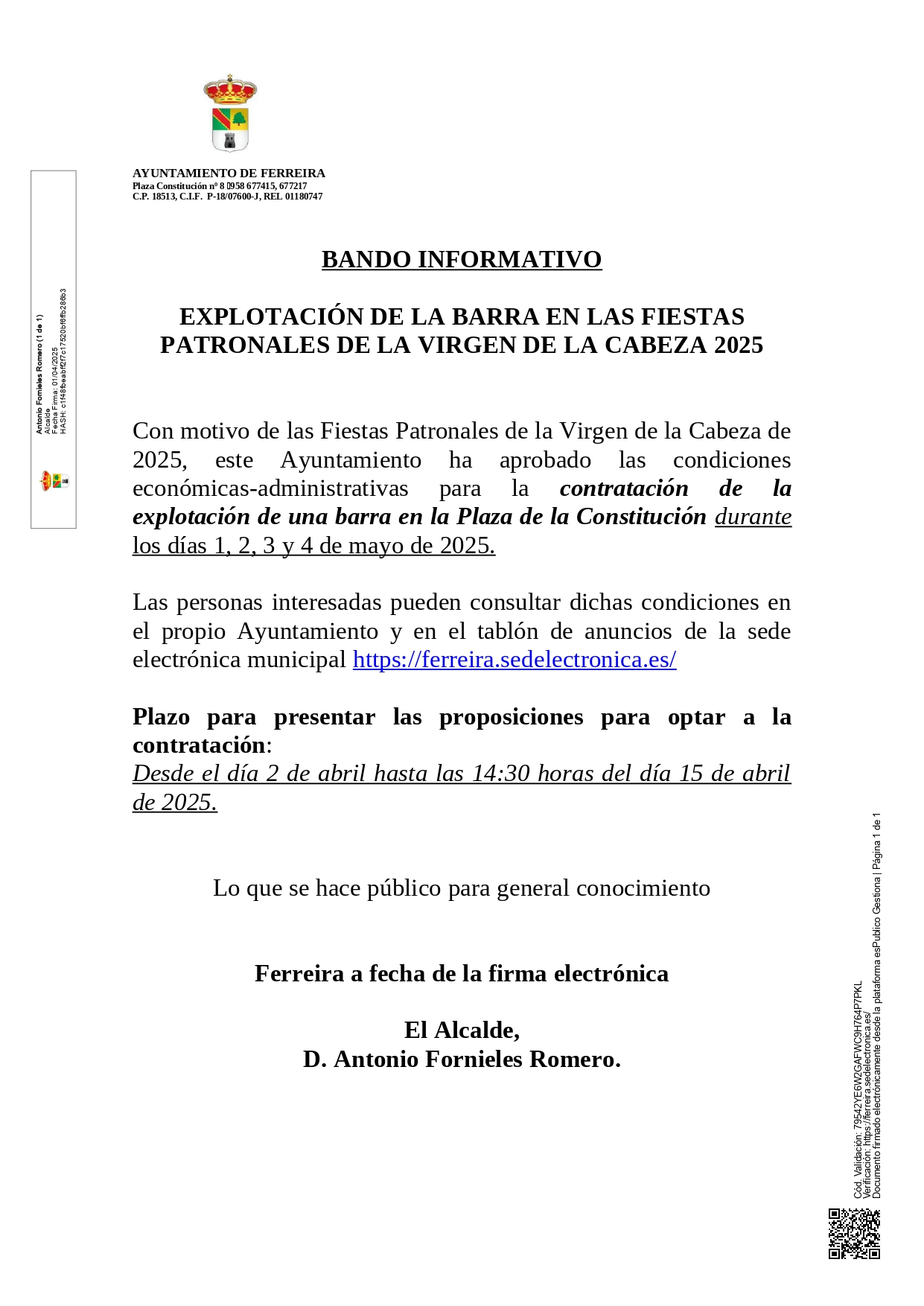 Las personas interesadas pueden consultar dichas condiciones en el propio Ayuntamiento y en el tablón de anuncios de la sede electrónica municipal https://ferreira.sedelectronica.es/
