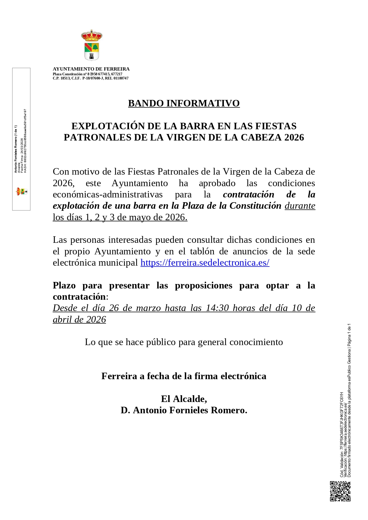 Con motivo de las Fiestas Patronales de la Virgen de la Cabeza de 2026, este Ayuntamiento ha aprobado las condiciones económicas-administrativas para la contratación de la explotación de una barra en la Plaza de la Constitución durante los días 1, 2 y 3 de mayo de 2026.