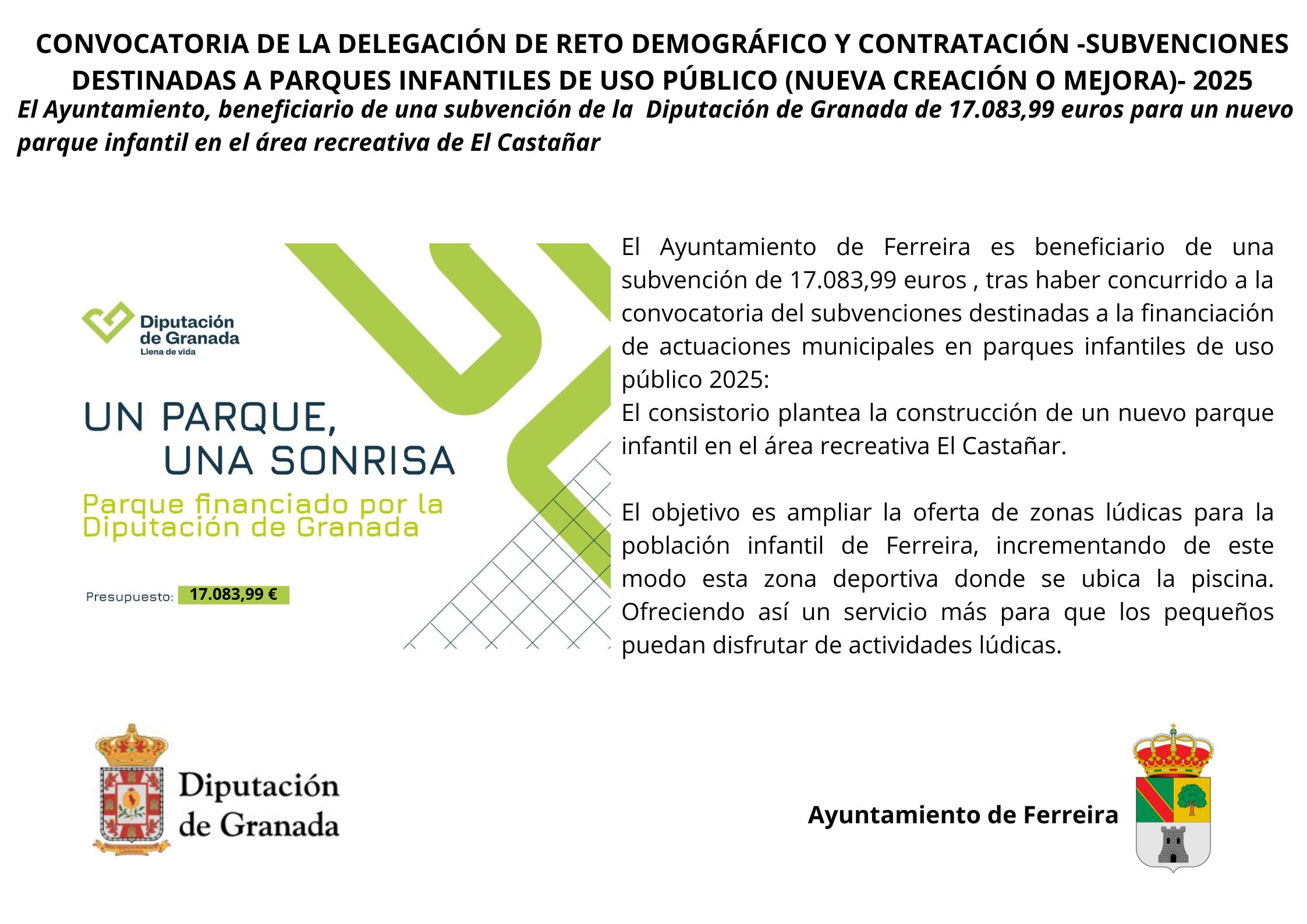 El Ayuntamiento de Ferreira es beneficiario de una subvención de 17.083,99 euros , tras haber concurrido a la convocatoria del subvenciones destinadas a la financiación de actuaciones municipales en parques infantiles de uso público 2025: