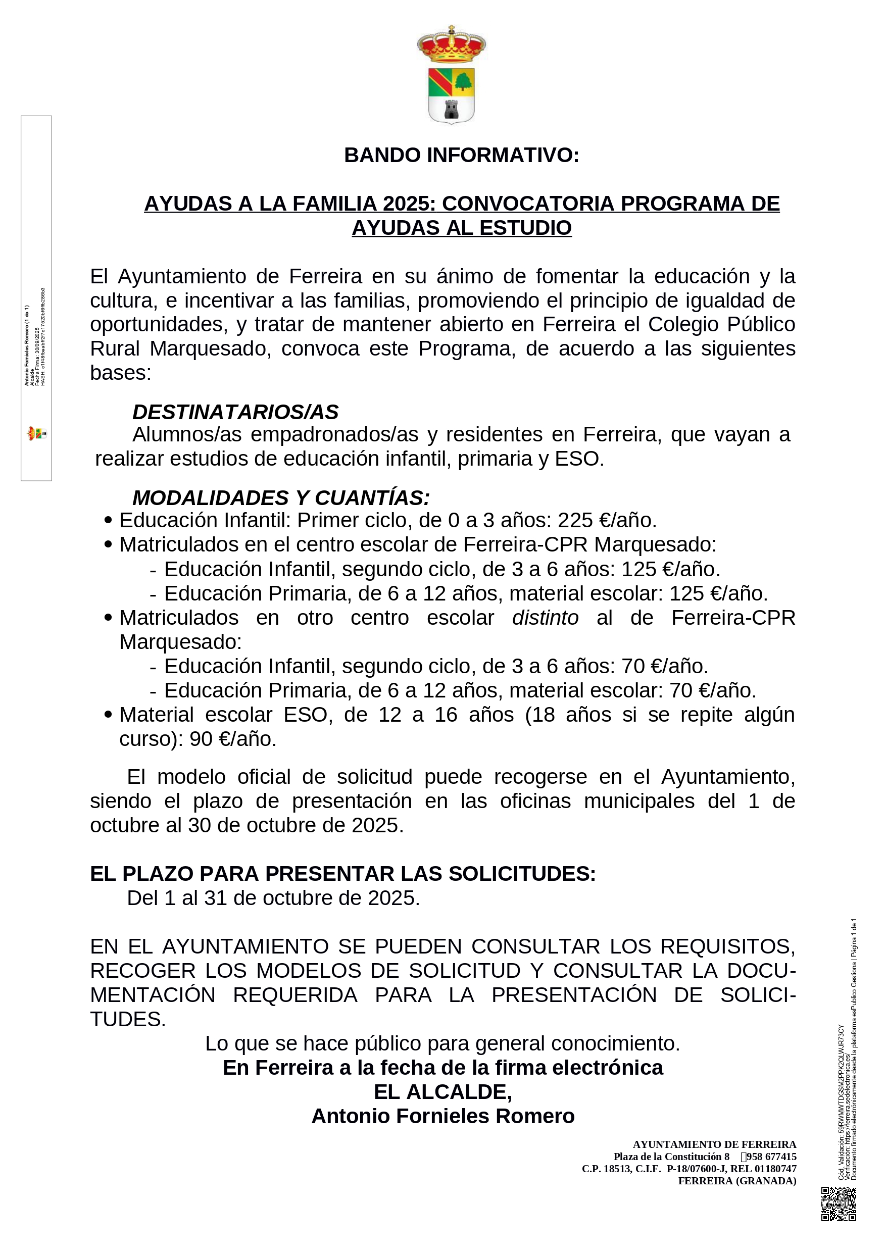 El Ayuntamiento de Ferreira en su ánimo de fomentar la educación y la cultura, e incentivar a las familias, promoviendo el principio de igualdad de oportunidades, y tratar de mantener abierto en Ferreira el Colegio Público Rural Marquesado, convoca este Programa, de acuerdo a las siguientes bases: